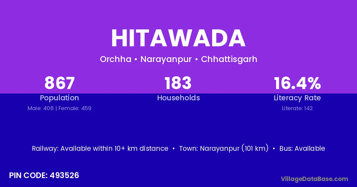 Narayanpur (101 km) is the nearest town to Hitawada village for major economic activities and is located approximately 101 km away.