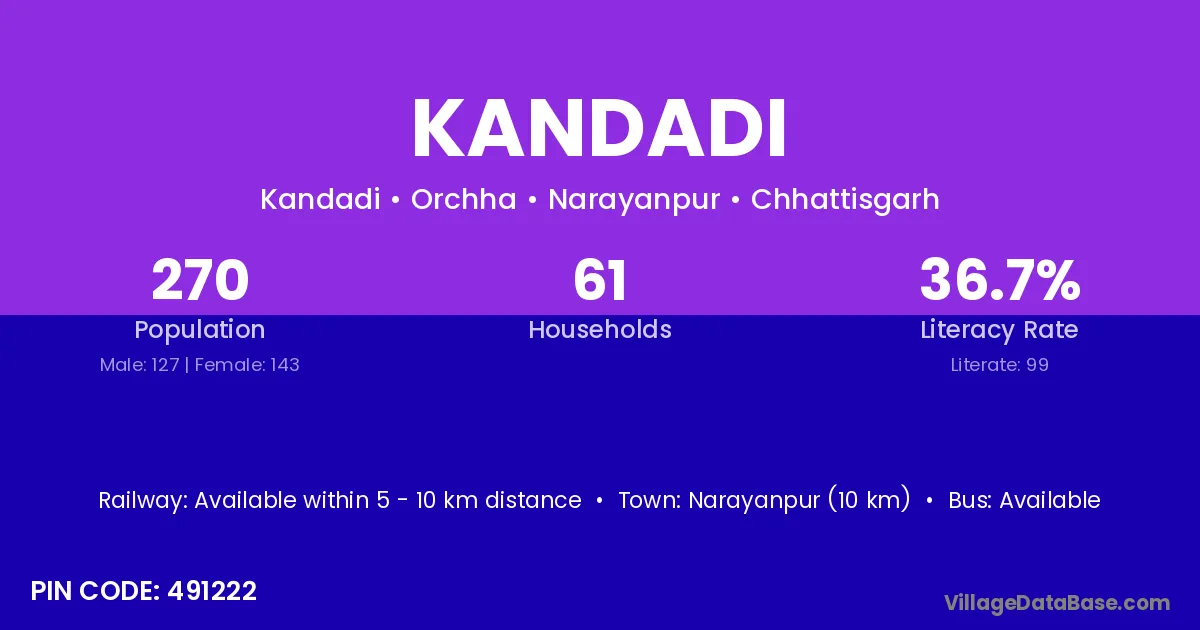 Narayanpur (10 km) is the nearest town to Kandadi village for major economic activities and is located approximately 10 km away.