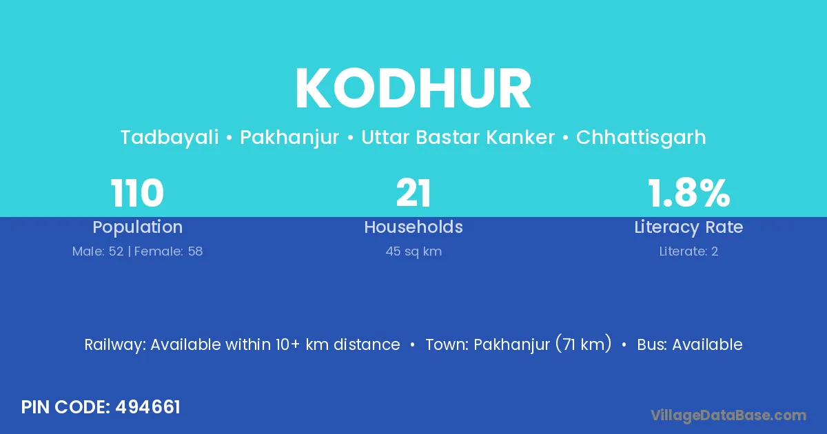 The literacy rate of Kodhur village is 0.00%. Male literacy stands at 0.00% and female literacy at 0.00%.