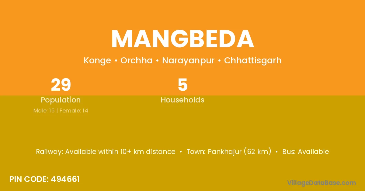 According to Census 2011 information, the village code of Mangbeda village is 494661.