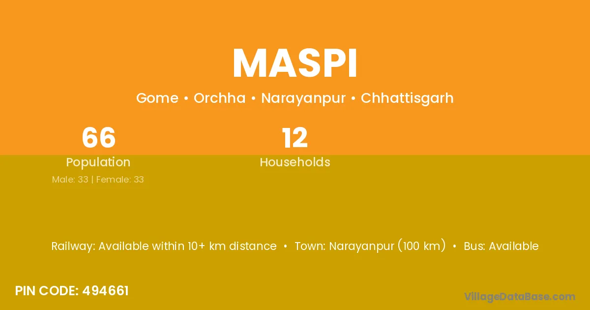 Maspi village has a total population of 66 people, of which 33 are males and 33 are females.