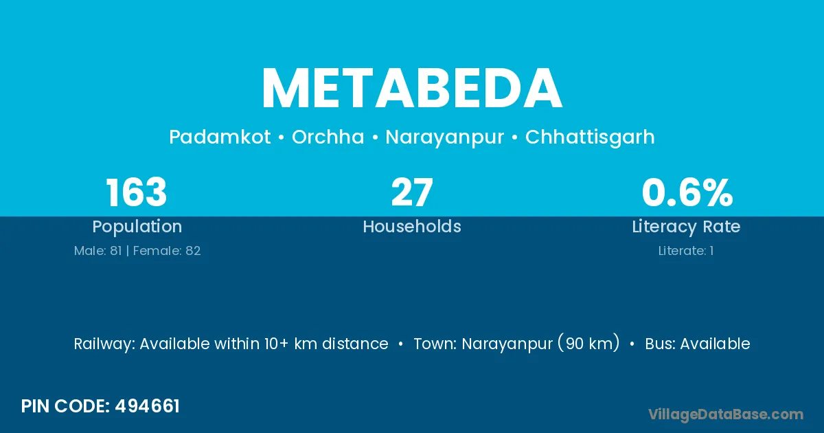 Narayanpur (90 km) is the nearest town to Metabeda village for major economic activities and is located approximately 90 km away.