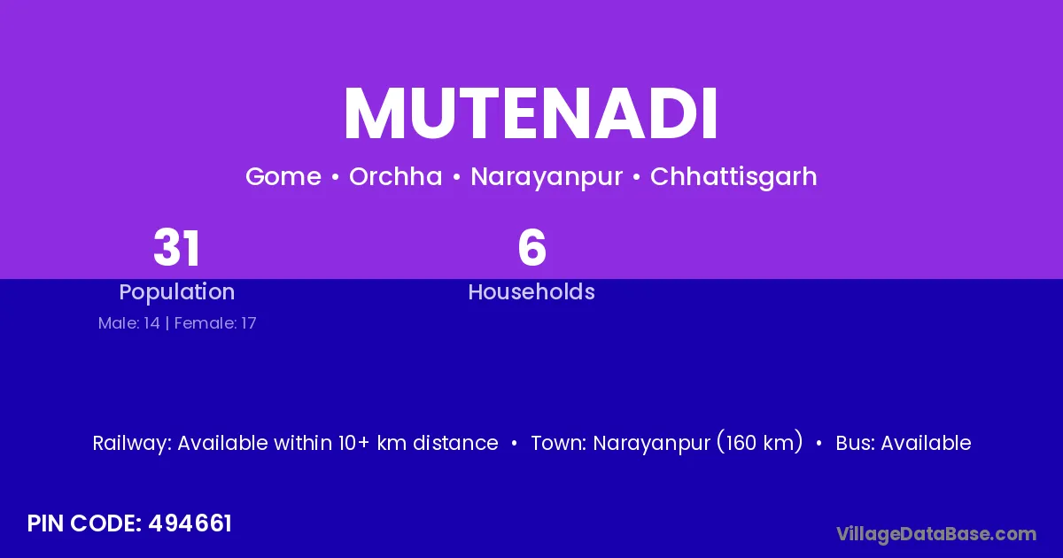 Narayanpur (160 km) is the nearest town to Mutenadi village for major economic activities and is located approximately 160 km away.