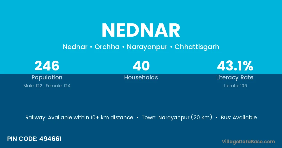 Narayanpur (20 km) is the nearest town to Nednar village for major economic activities and is located approximately 20 km away.