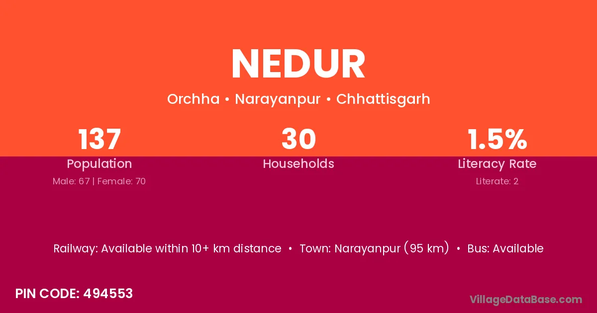 Narayanpur (95 km) is the nearest town to Nedur village for major economic activities and is located approximately 95 km away.