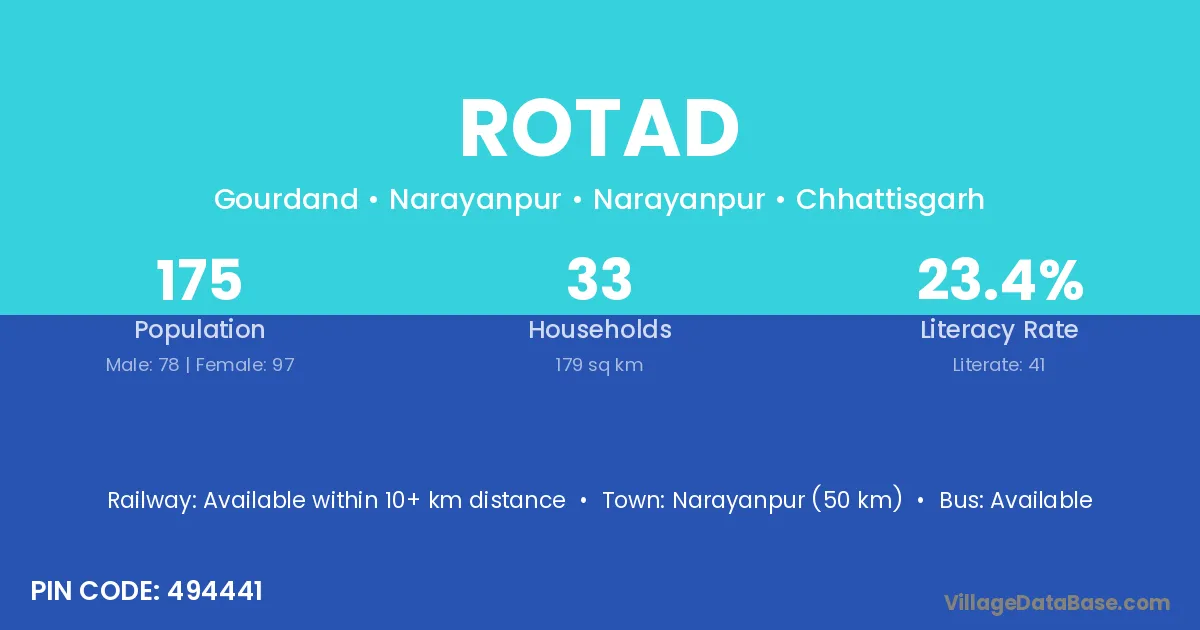 Narayanpur (75 km) is the nearest town to Rotad village for major economic activities and is located approximately 75 km away.