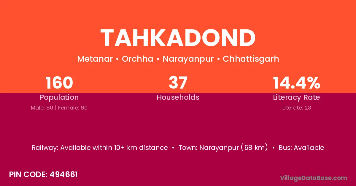 Narayanpur (68 km) is the nearest town to Tahkadond village for major economic activities and is located approximately 68 km away.