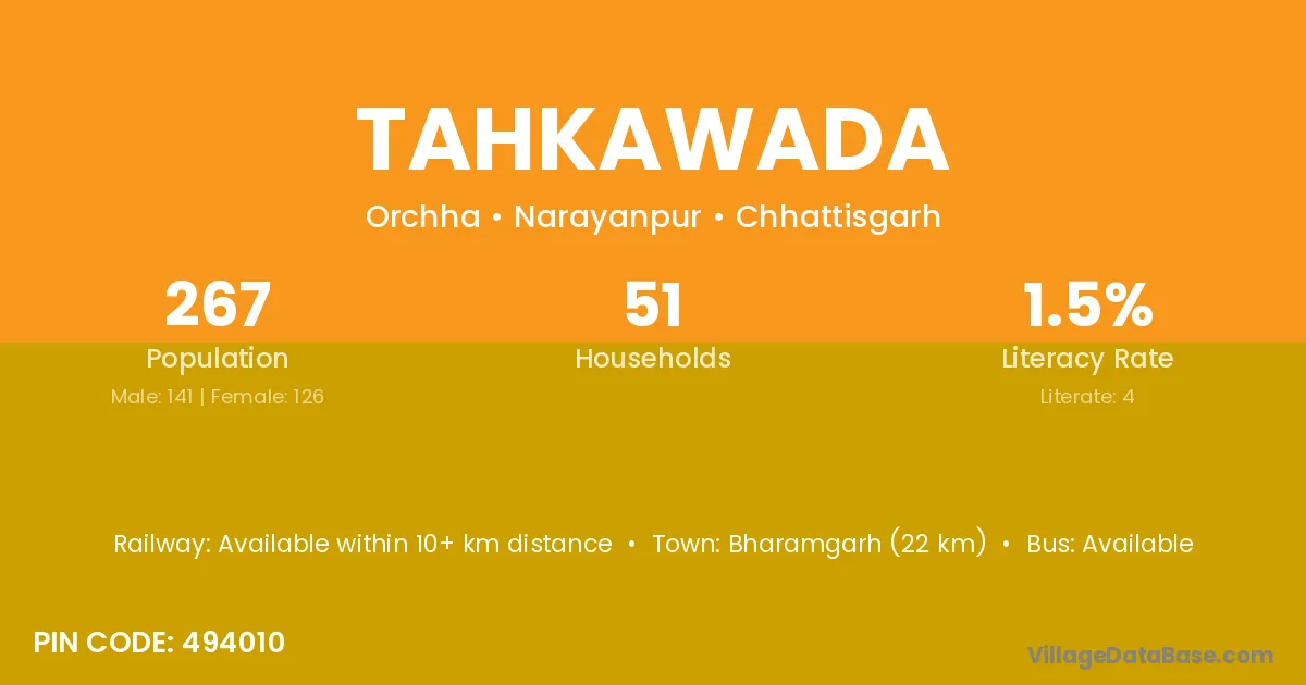Tahkawada village has a total population of 267 people, of which 141 are males and 126 are females.