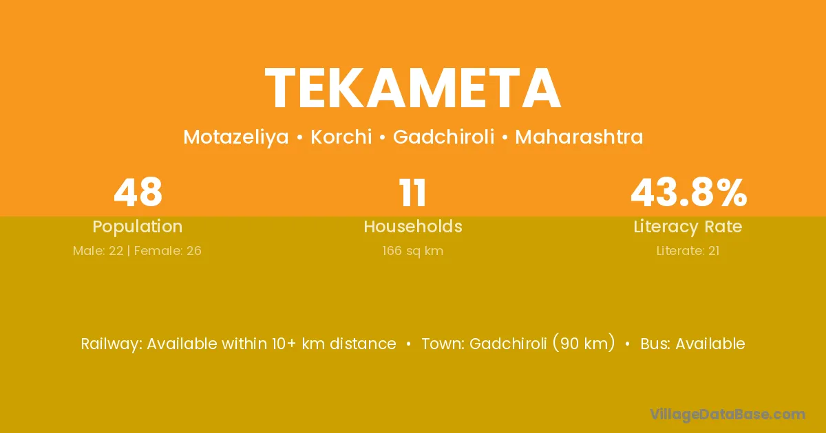 Pankhajur (64 km) is the nearest town to Tekameta village for major economic activities and is located approximately 64 km away.
