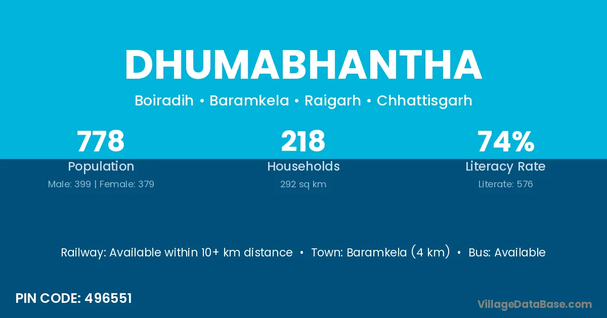 Baramkela (4 km) is the nearest town to Dhumabhantha village for major economic activities and is located approximately 4 km away.