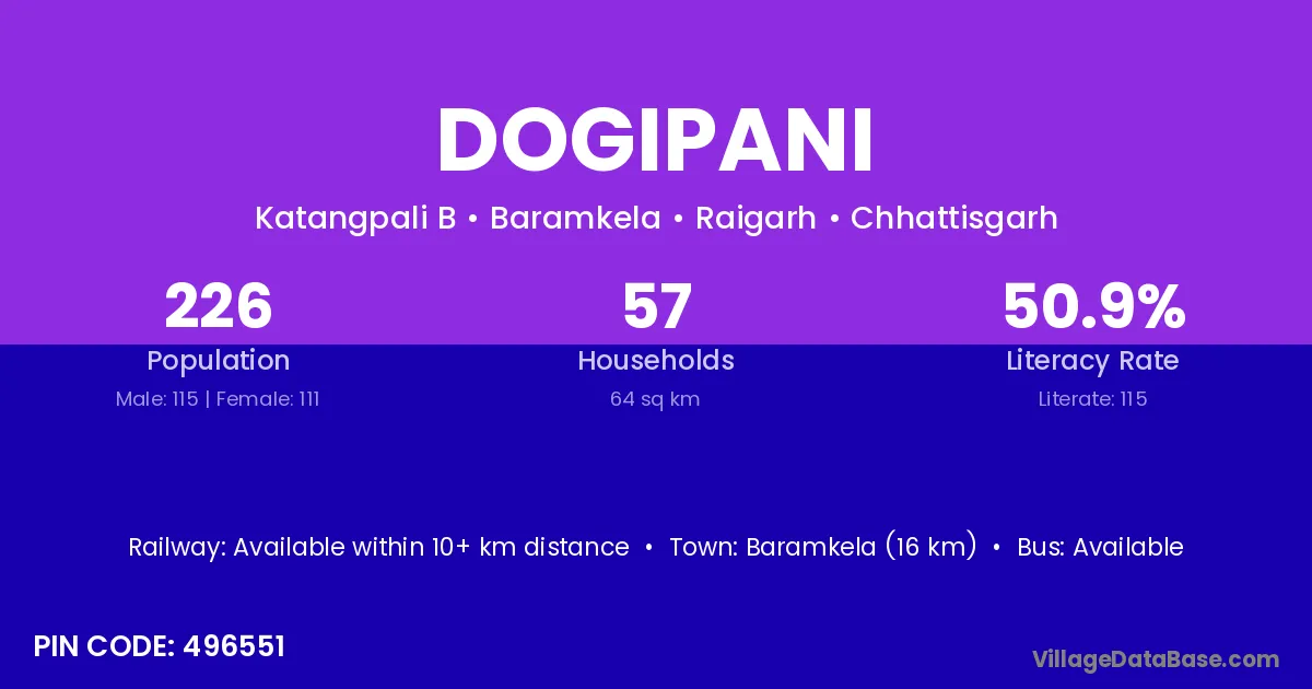 Dogipani village has a total population of 226 people, of which 115 are males and 111 are females.