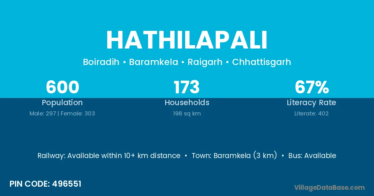 Hathilapali village has a total population of 600 people, of which 297 are males and 303 are females.