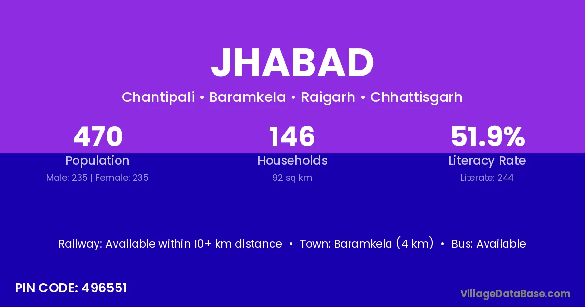 Baramkela (4 km) is the nearest town to Jhabad village for major economic activities and is located approximately 4 km away.