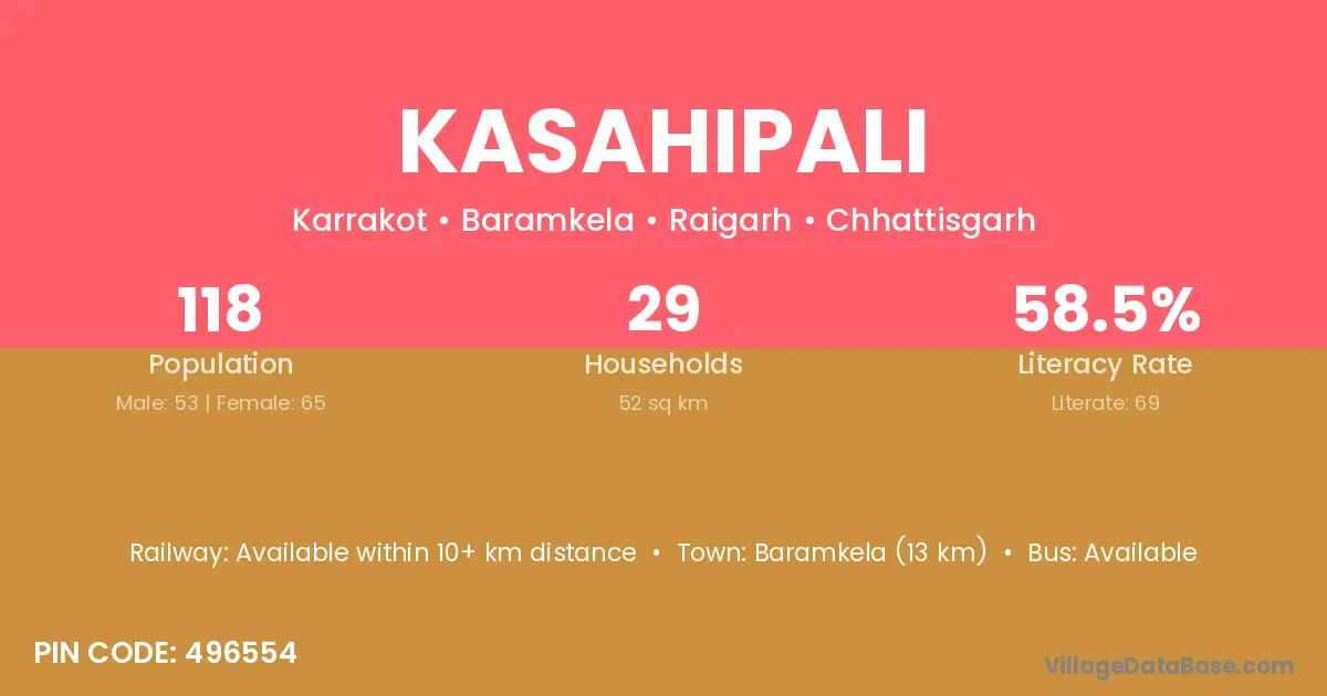 Kasahipali village has a total population of 118 people, of which 53 are males and 65 are females.