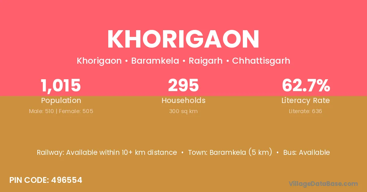 Baramkela (5 km) is the nearest town to Khorigaon village for major economic activities and is located approximately 5 km away.