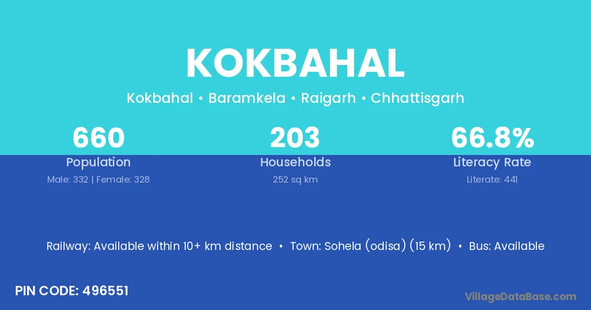 Kokbahal village has a total population of 660 people, of which 332 are males and 328 are females.