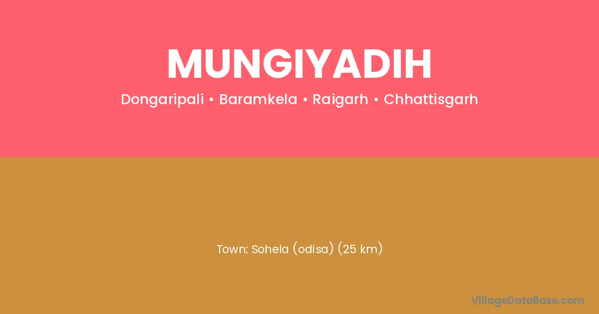 Sohela (odisa) (25 km) is the nearest town to Mungiyadih village for major economic activities and is located approximately 25 km away.
