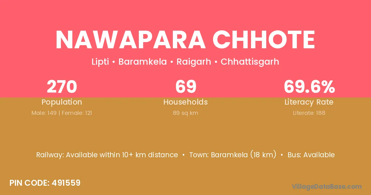 Baramkela (18 km) is the nearest town to Nawapara Chhote village for major economic activities and is located approximately 18 km away.
