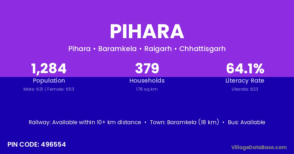 Baramkela (18 km) is the nearest town to Pihara village for major economic activities and is located approximately 18 km away.
