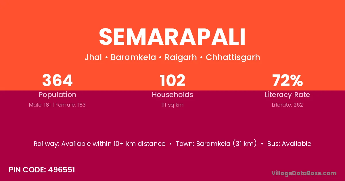 Baramkela (31 km) is the nearest town to Semarapali village for major economic activities and is located approximately 31 km away.