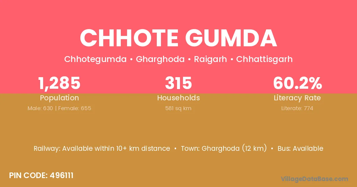 Chhote Gumda village has a total population of 1,285 people, of which 630 are males and 655 are females.