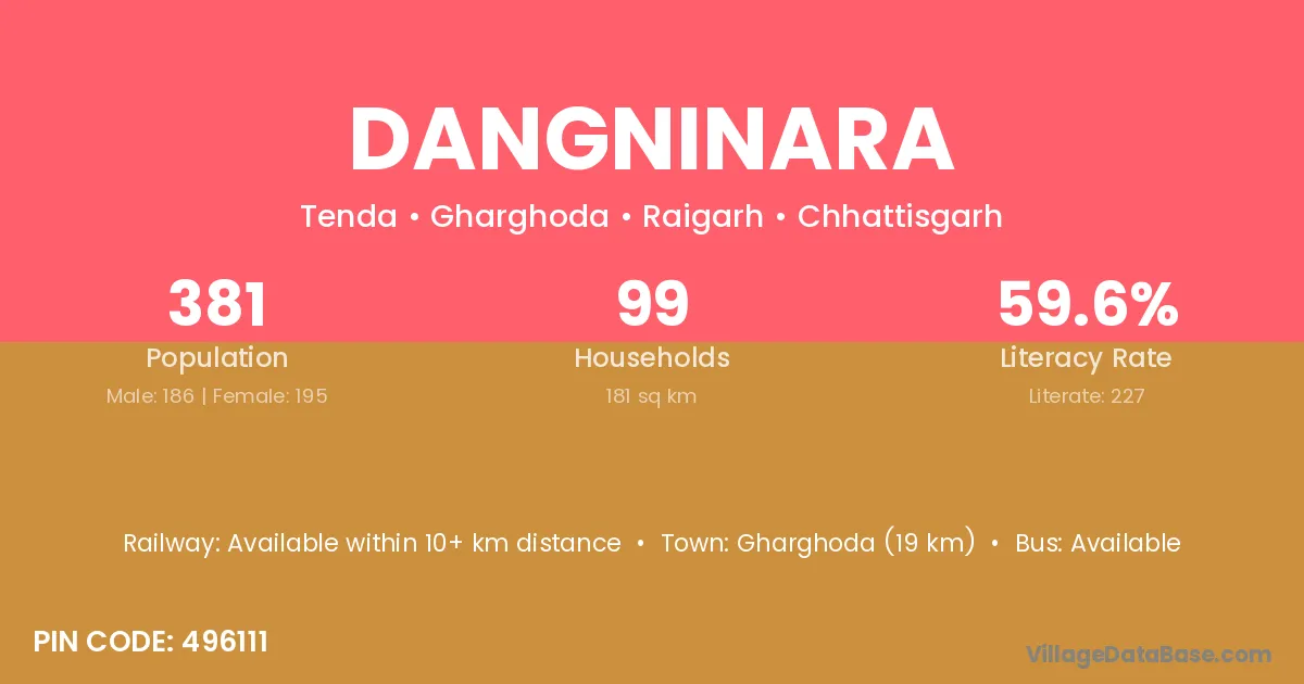 Gharghoda (19 km) is the nearest town to Dangninara village for major economic activities and is located approximately 19 km away.