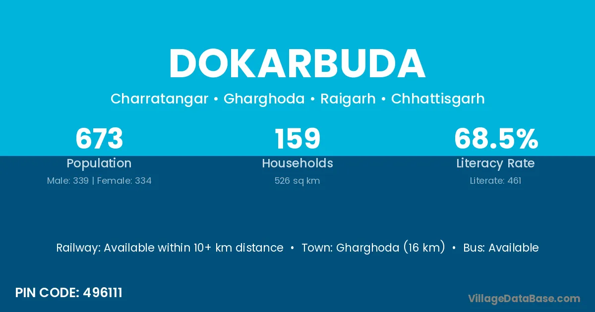 Gharghoda (16 km) is the nearest town to Dokarbuda village for major economic activities and is located approximately 16 km away.
