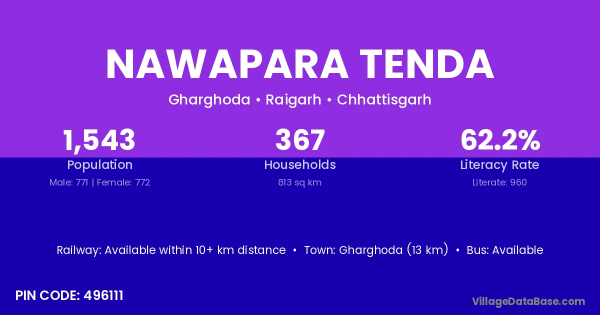 Gharghoda (13 km) is the nearest town to Nawapara Tenda village for major economic activities and is located approximately 13 km away.