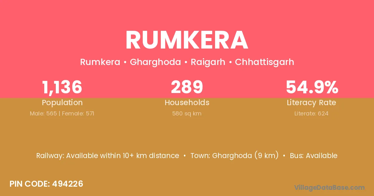 Rumkera village has a total population of 1,136 people, of which 565 are males and 571 are females.
