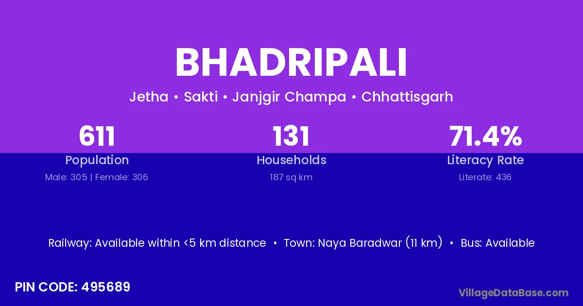 Kharsia (8 km) is the nearest town to Bhadripali village for major economic activities and is located approximately 8 km away.