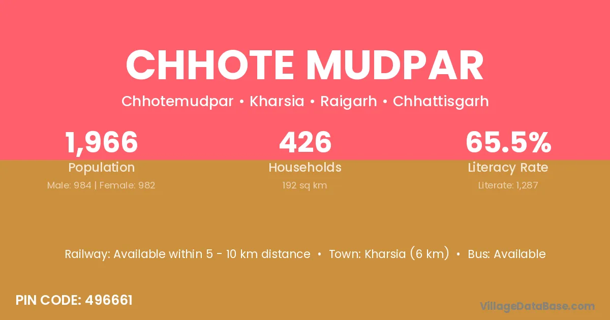 Kharsia (6 km) is the nearest town to Chhote Mudpar village for major economic activities and is located approximately 6 km away.