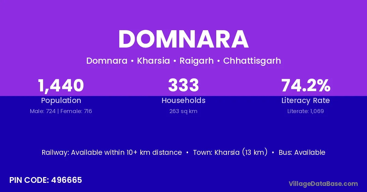 Kharsia (13 km) is the nearest town to Domnara village for major economic activities and is located approximately 13 km away.