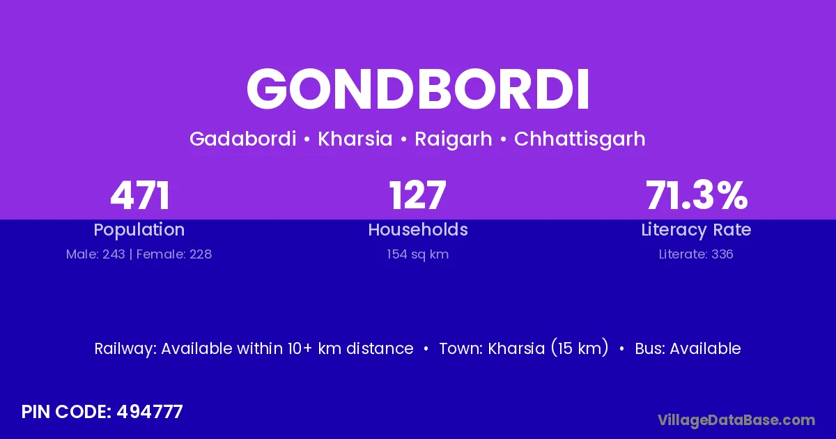 Kharsia (15 km) is the nearest town to Gondbordi village for major economic activities and is located approximately 15 km away.