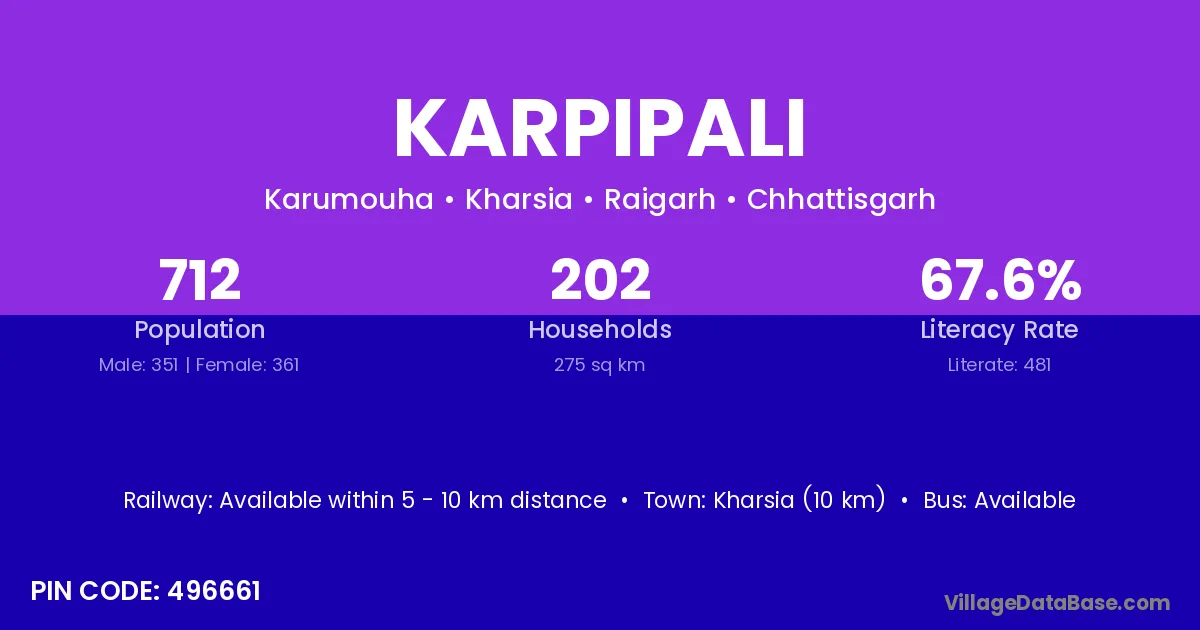 Karpipali village has a total population of 712 people, of which 351 are males and 361 are females.