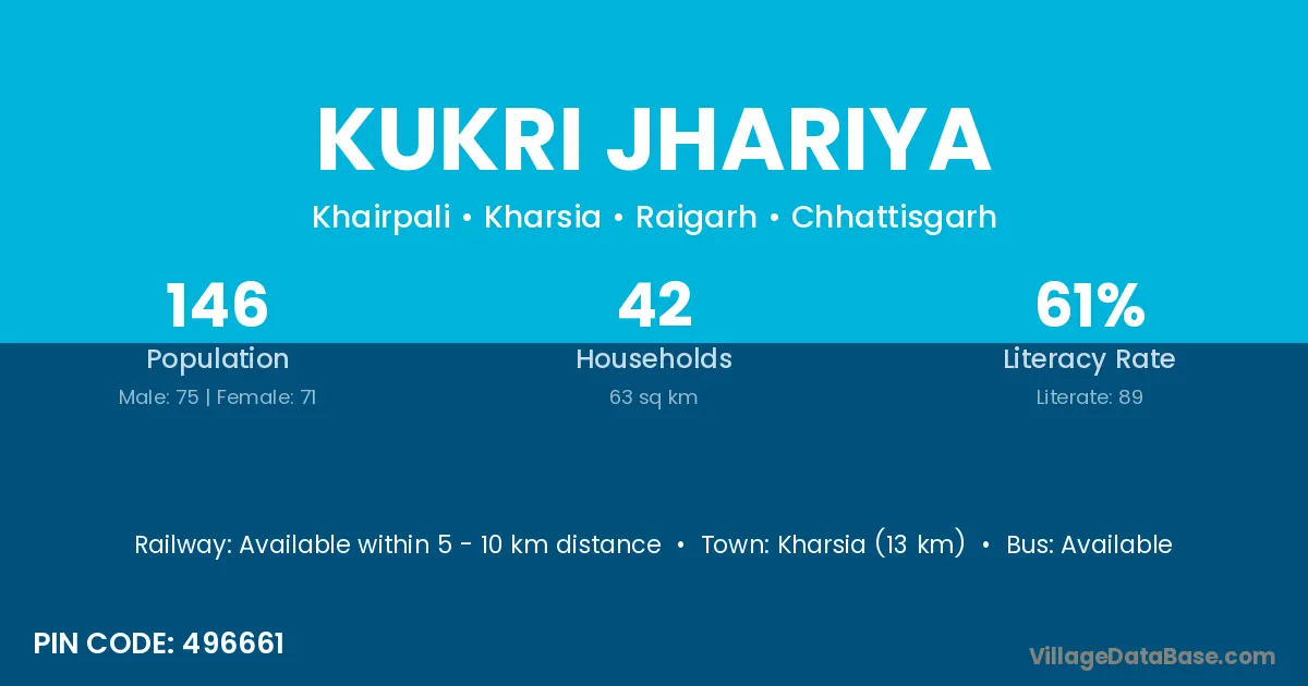 Kharsia (13 km) is the nearest town to Kukri Jhariya village for major economic activities and is located approximately 13 km away.