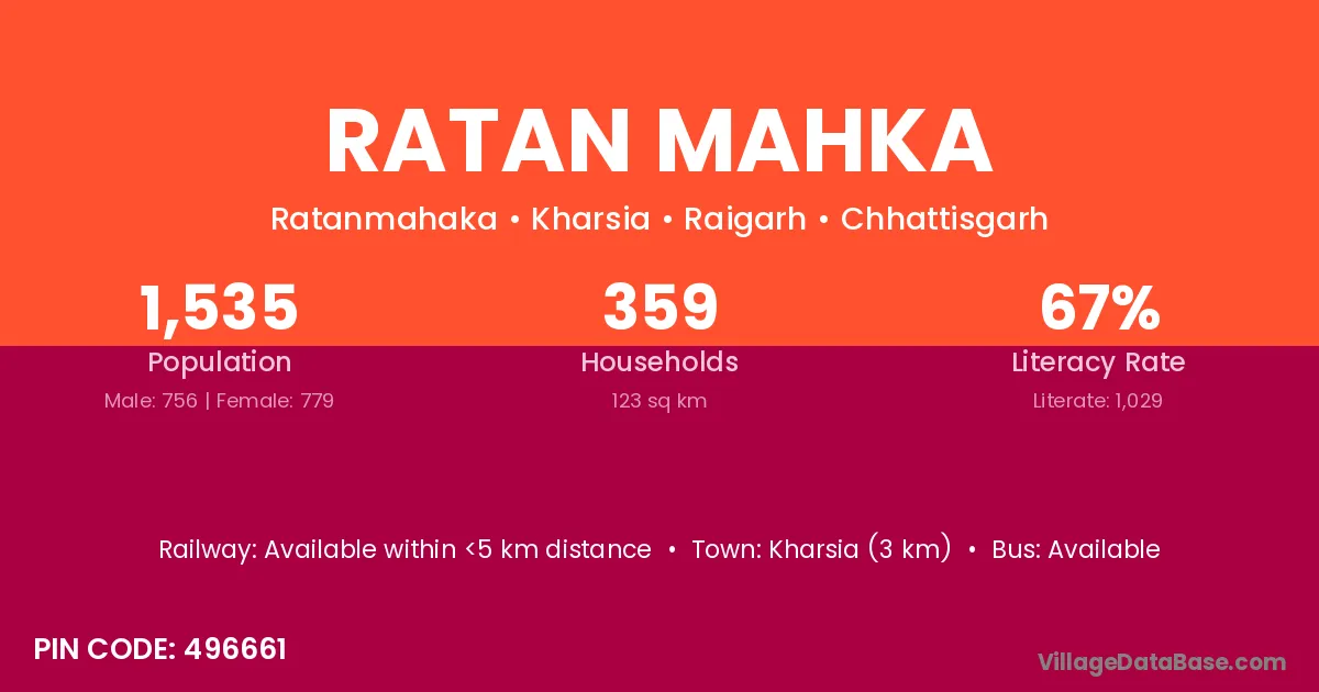 Kharsia (3 km) is the nearest town to Ratan Mahka village for major economic activities and is located approximately 3 km away.