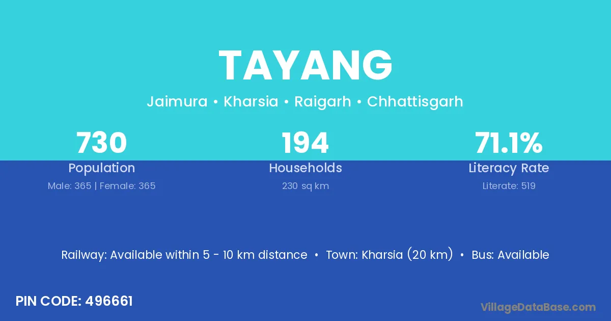 Kharsia (20 km) is the nearest town to Tayang village for major economic activities and is located approximately 20 km away.
