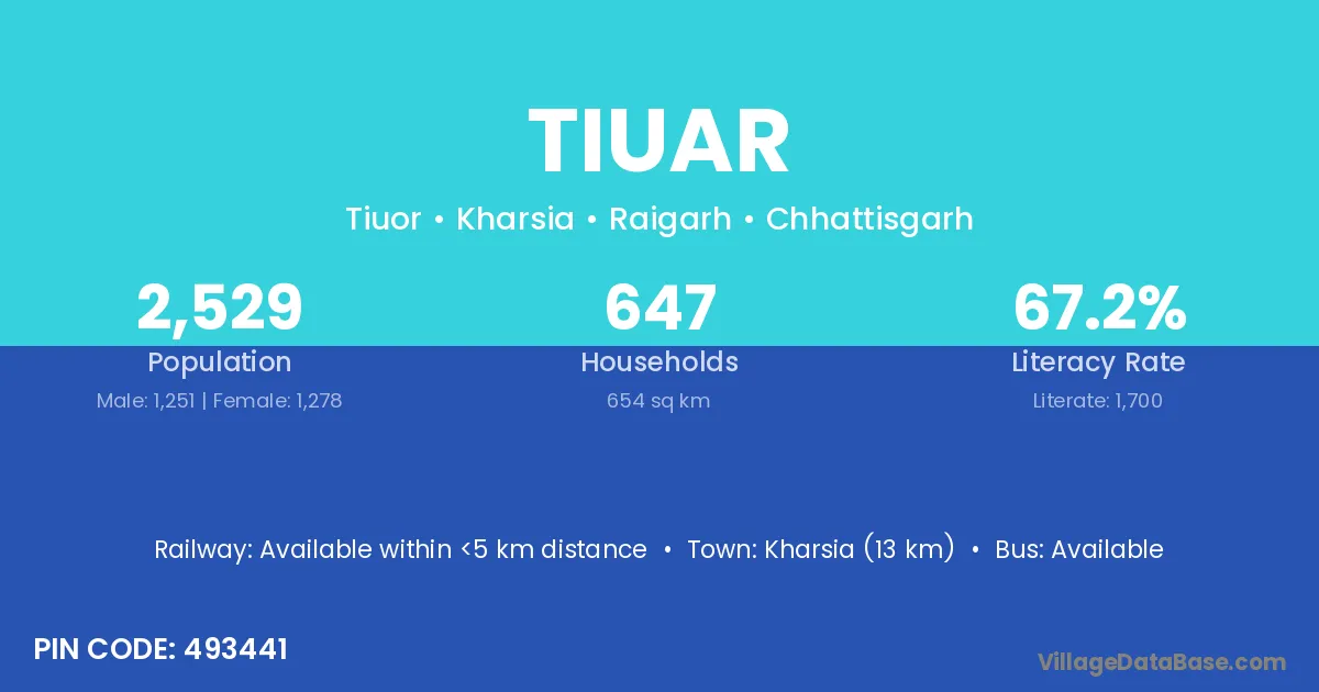 Kharsia (13 km) is the nearest town to Tiuar village for major economic activities and is located approximately 13 km away.