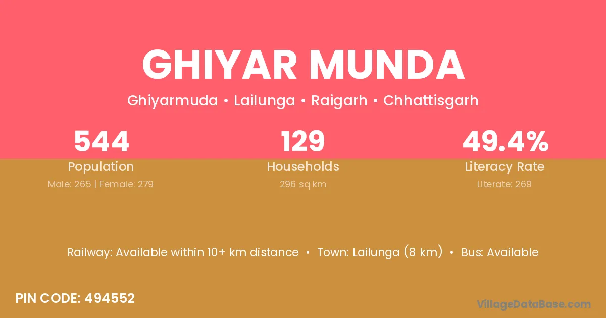 Lailunga (8 km) is the nearest town to Ghiyar Munda village for major economic activities and is located approximately 8 km away.