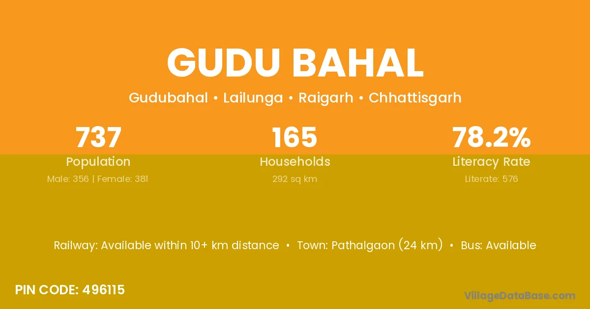 Pathalgaon (24 km) is the nearest town to Gudu Bahal village for major economic activities and is located approximately 24 km away.