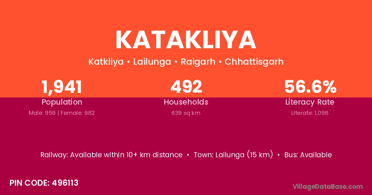Katakliya village has a total population of 1,941 people, of which 959 are males and 982 are females.