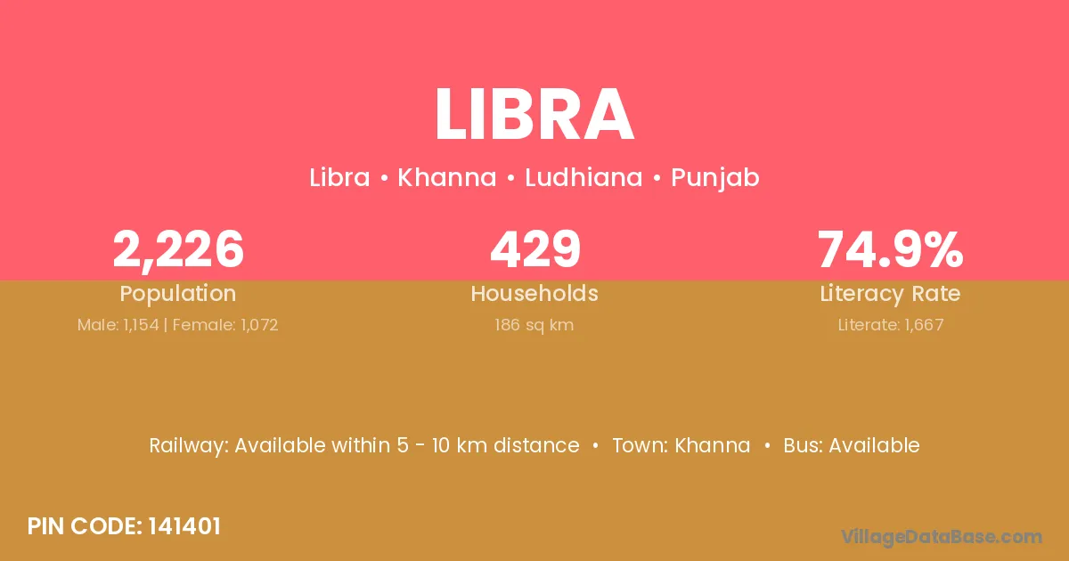 The literacy rate of Libra village is 55.44%. Male literacy stands at 63.75% and female literacy at 47.00%.