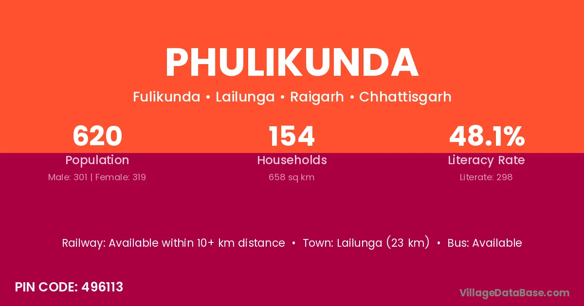 Phulikunda village has a total population of 620 people, of which 301 are males and 319 are females.