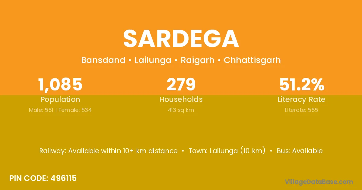 Sardega village has a total population of 1,085 people, of which 551 are males and 534 are females.