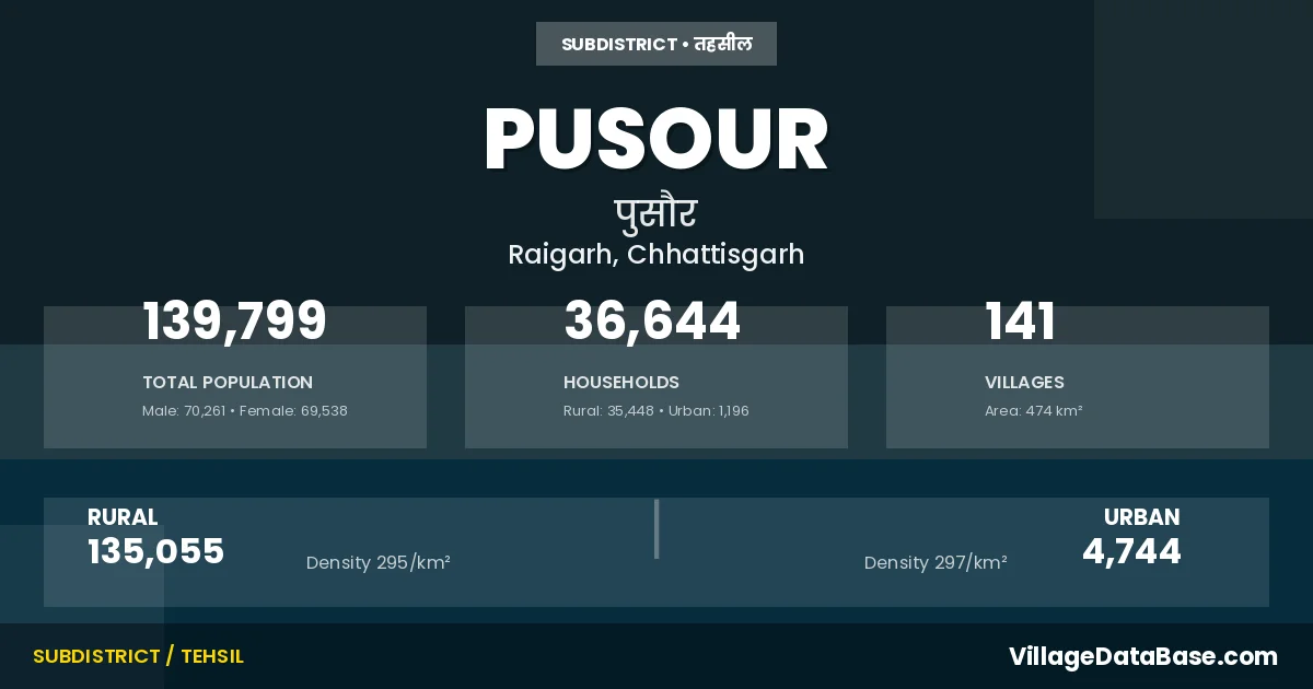 Pusour is a town and Tehsil in the Raigarh district of the Chhattisgarh. In India, a Tehsil is a subdivision of a district responsible for the administration and revenue collection of a specific area within the district. Tehsils play a crucial role in the local governance structure, contributing significantly to the development and administration of their communities.