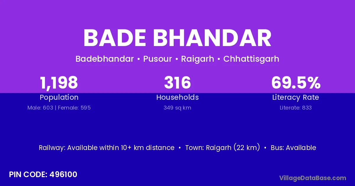 Raigarh (22 km) is the nearest town to Bade Bhandar village for major economic activities and is located approximately 22 km away.