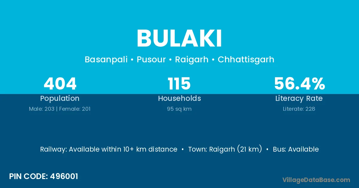 Raigarh (21 km) is the nearest town to Bulaki village for major economic activities and is located approximately 21 km away.