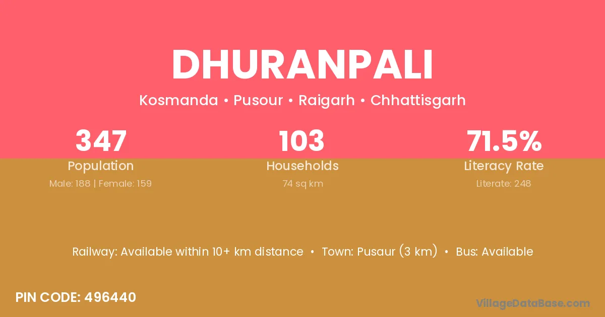 Dhuranpali village has a total population of 347 people, of which 188 are males and 159 are females.
