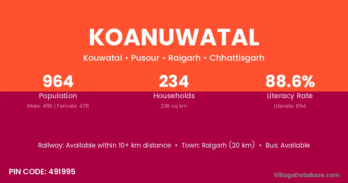 Koanuwatal village has a total population of 964 people, of which 486 are males and 478 are females.