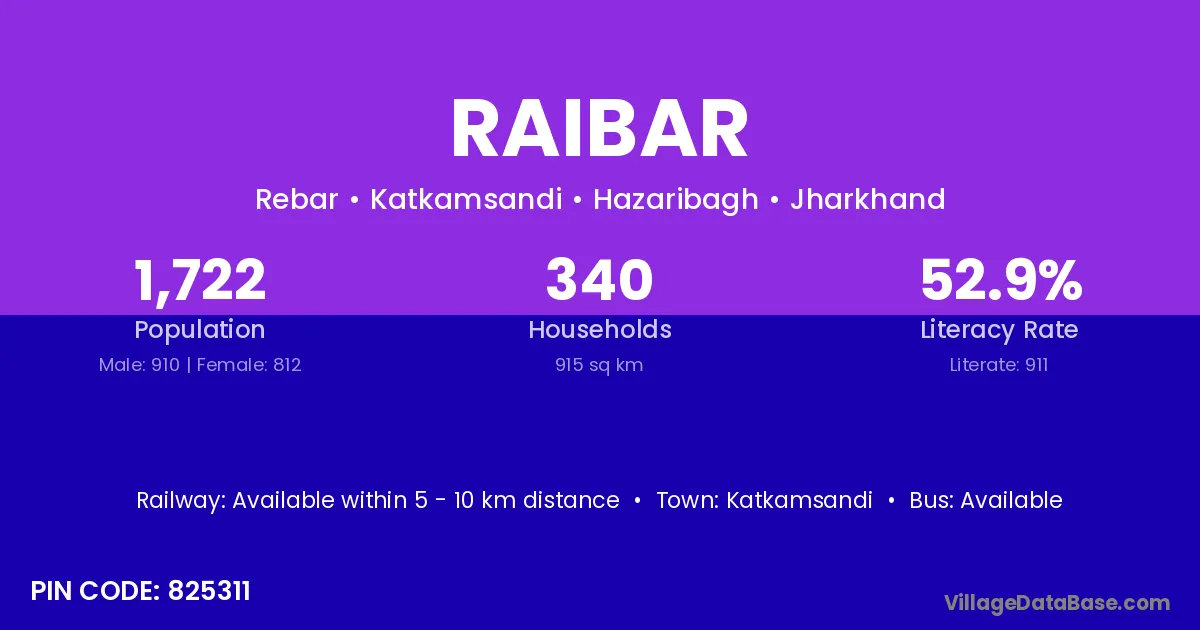 According to Census 2011 information, the village code of Raibar village is 496100.